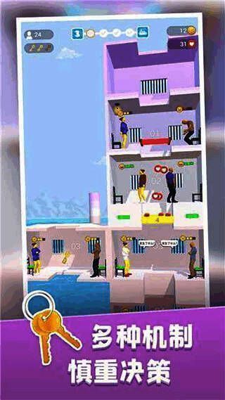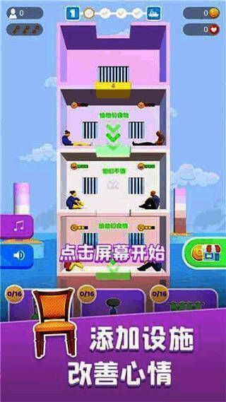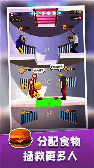 初次进入游戏时,玩家只需点击屏幕即可开始挑战。通过按住屏幕控制黄色移动平台下降,长按可加速下落,松手即停。每个平台上都居住着等待食物的犯人,他们的需求以红黄绿三色标记,玩家需根据实际状况精准投放食物资源。