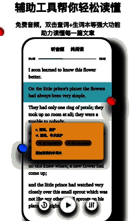 除了内容上的广泛覆盖,《薄荷阅读》还具备一系列贴心的学习辅助功能。例如,其“即时词汇查找”系统允许用户在阅读过程中点击生词直接查释义,并自动记录新单词以便后续复习巩固;每日签到机制则有效激励用户坚持阅读习惯,同时还能与好友分享进度、互动交流。此外,部分书籍配有专业配音的真人语音朗读,有助于提升听力水平与语感训练。