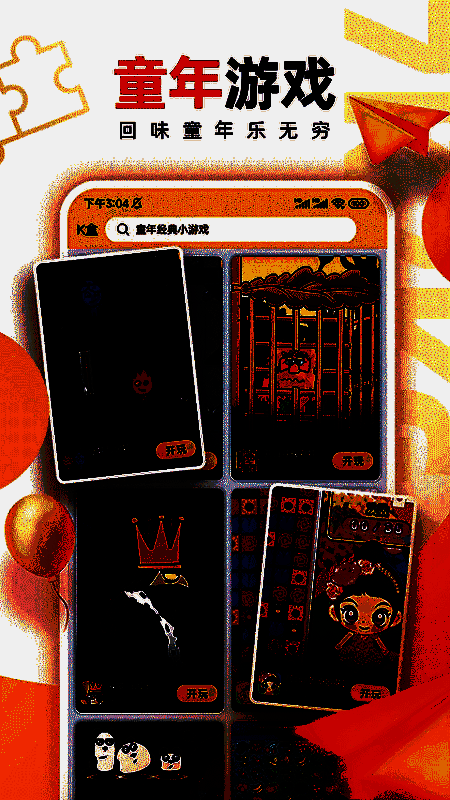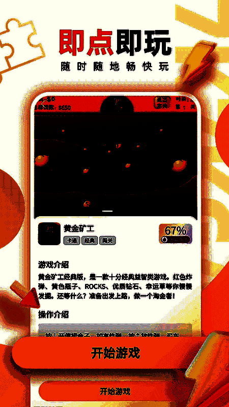 在主界面中,用户可直接点击“开玩”进入游戏;在分类页面中,可按类型搜索或浏览各类游戏资源;“我的”界面则记录了最近游玩的游戏及时间,方便继续游戏。此外,在游戏过程中点击右上角菜单,还可选择返回首页、重新进入或退出等操作。