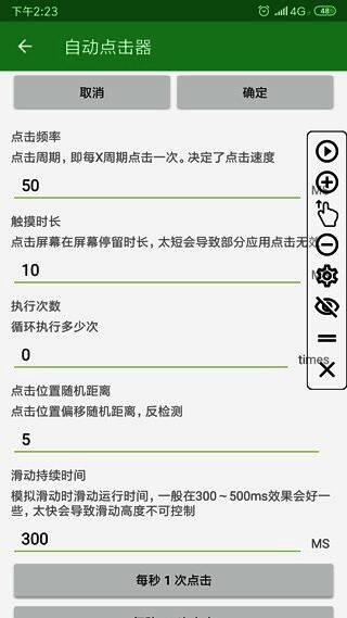 这款自动连点器具备高度自由化的参数配置功能,用户可以根据实际需要精确调整点击周期、触摸时长以及执行次数等多项指标。此外,还提供随机点击位置的功能,以规避系统对规律点击行为的识别风险。滑动持续时间也可自由设定,确保整个操作过程更加自然流畅。