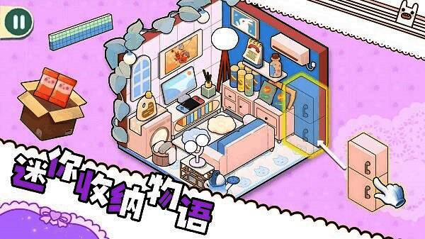 游戏内设有多样化的房间场景,如卧室、厨房、书房等,每个区域都有独特的收纳需求与任务目标。玩家可以根据不同物品的属性,灵活选择合适的收纳工具,例如收纳盒、挂钩、隔板等。