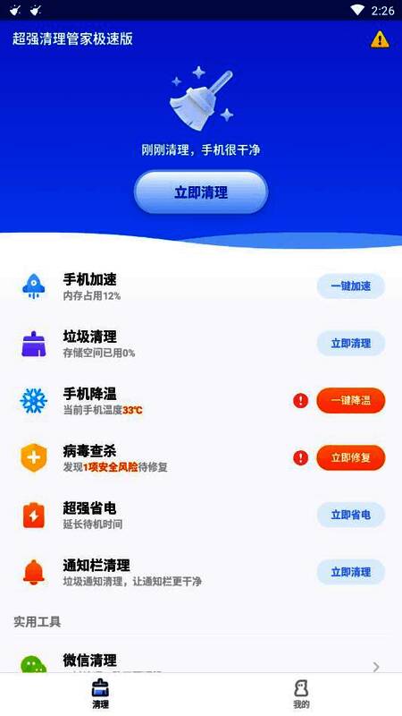 《超强清理管家极速版》是一款专注于手机优化与安全防护的免费清理工具,凭借其高效、简洁的操作界面和全面的功能体系,迅速在安卓用户群体中积累了良好的口碑。无论是系统垃圾清理、病毒查杀,还是性能加速、电池管理,这款软件都能为用户提供一站式的解决方案,真正实现手机运行效率的全面提升。