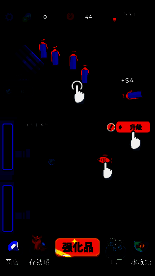 游戏的操作非常直观,点击小鱼可以加速气泡收集,提高氧气产量;点击烟囱则能加快氧气瓶的生产效率,而滑动传送带则有助于更快地完成销售流程。此外,升级小鱼等级不仅能提升其产氧能力,还能增强游泳速度和气泡价值,所需金币可通过售卖氧气瓶获得。