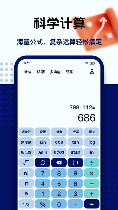该软件的一大优势在于其强大的单位换算能力,涵盖体积、重量、时间、长度、面积和温度等多种常见单位,极大地方便了用户的日常使用。此外,它还内置科学计算器,能够处理复杂的数学公式与函数运算,如三角函数和对数函数。用户还可以轻松调用历史计算记录,避免重复输入,提高效率。