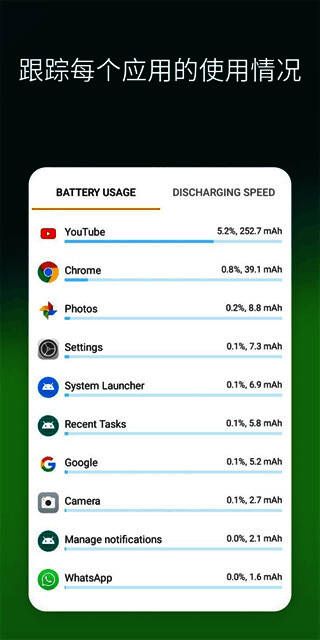AccuBattery提供实时的充放电速率监测,并能追踪每个应用程序的耗电情况。这种精细化的管理方式,让用户清楚地知道哪些App在“偷电”,从而及时关闭不必要的后台进程,节省电量消耗。