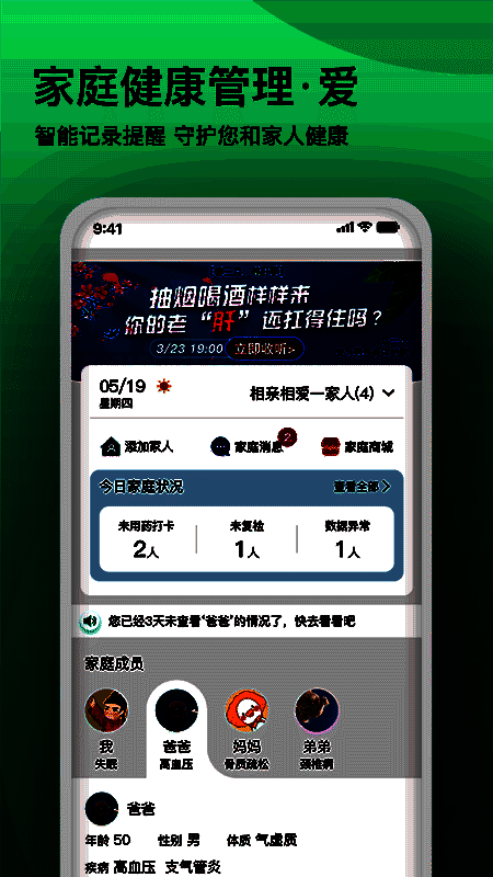 这款应用的一大亮点是其独特的“家庭群”功能,允许用户与家人共同记录健康生活轨迹,实现真正的亲情互联。通过这一平台,每位家庭成员都可以随时查看彼此的健康动态,形成互相监督、共同进步的良好氛围。此外,“关心一下”还支持健康数据追踪与分析,让用户能够实时掌握自身身体状况,并借助智能提醒功能及时调整生活习惯。