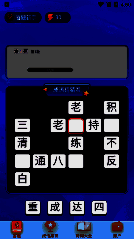 《极速猜成语》提供了多种趣味十足的游戏模式,满足不同玩家的需求。经典闯关模式让玩家循序渐进地掌握成语知识;限时挑战则考验反应速度与记忆储备;好友对战带来竞技乐趣,实时PK谁才是真正的成语达人;而成语接龙则锻炼玩家的联想能力与词汇积累。