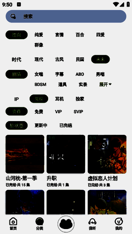 2、对广播剧进行了详细的分类,并支持关键词搜索,帮助用户快速找到心仪的广播剧。
