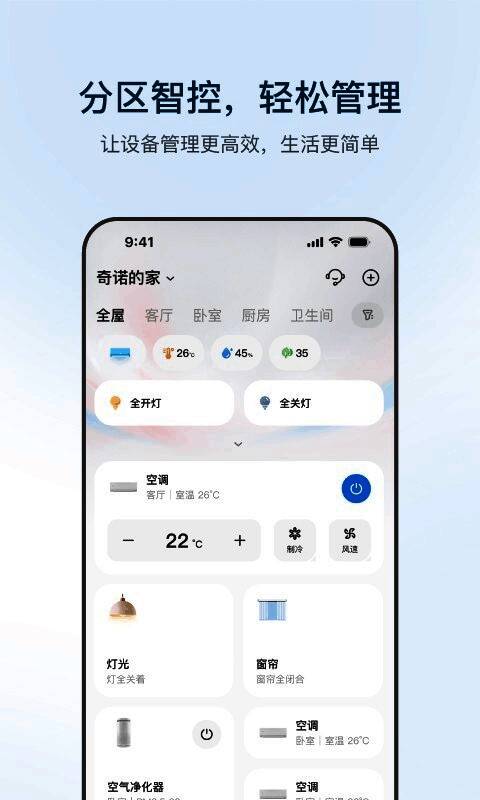 在这里可以使用手机控制空调的各种功能,例如调整温度,可通过滑动或点击按钮来实现对空调温度的精准调节;选择工作模式,根据需要选择制冷、制热、除湿或送风等不同的工作模式。