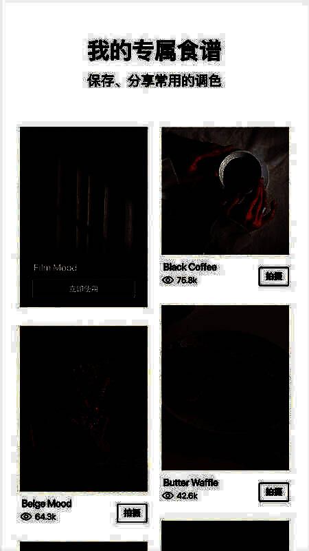 foodie 拍美食专用相机是一款专业的在线食品照片应用程序。收集各种食物的专业滤镜可以直接在线使用,也可以用于闪光、模糊、延时摄影、网格线等操作,让朋友拍出更漂亮的食物照片!此外,它还支持用户使用20多个滤镜拍摄定制的食品照片,并具有出色的照片编辑功能,您的简单食品照片将被制作成杰森!旨在帮助用户轻松拍摄有吸引力的专业级食品照片。该应用程序内置了专门针对食物优化的过滤器和编辑工具,可以使普通手机镜头下的食物看起来更美味、更有吸引力。打开应用程序,可以直接进入拍摄界面。用户只需点击滤镜按钮,根据拍摄食物的特点选择合适的滤镜效果,然后立即拍摄。