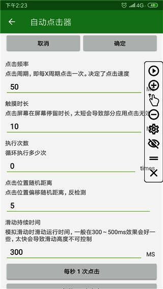设置全局点击间隔、触摸持续时间和重复次数。里面的小助手可以快速设置你需要的点击次数,只需简单的点击几下。