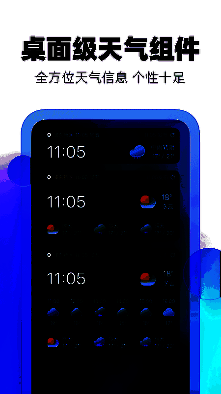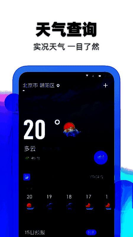 该软件采用简洁清新的蓝色与白色主色调界面,给人以宁静舒适的感受。布局直观易懂,主要功能模块一目了然,便于用户快速获取所需信息。此外,应用还加入了雨点落下、雪花飘过等动态天气特效,并提供夜间模式,有效减少夜间使用时对眼睛的刺激。