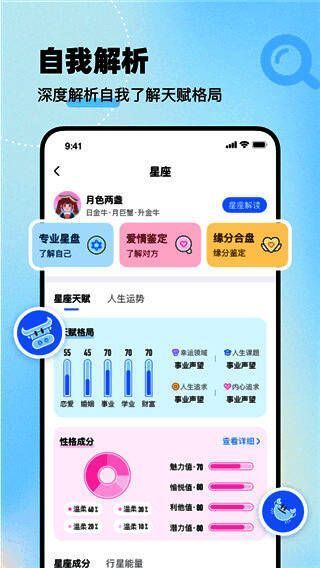 3.星盘分析,全面解读和理解真实自我;人格构成、内外属性、性格卡片一目了然;