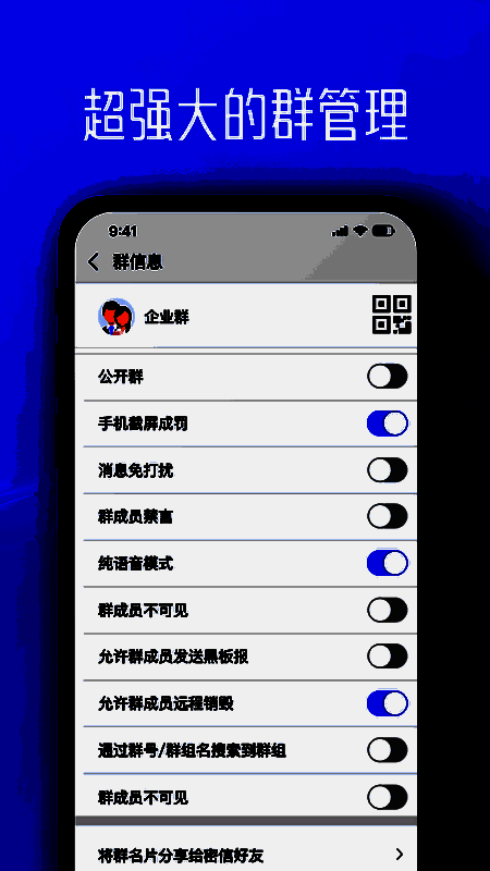 1、在线设置群,一键添加群成员,快速发布公告,便捷管理。