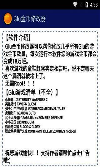 Glu金币修改器官方版是一款专为安卓平台打造的游戏辅助工具,能够帮助玩家轻松修改多款Glu旗下游戏的金币数量。该软件无需ROOT权限即可安装使用,并且默认将金币调整为18万以上,极大提升了游戏体验。对于喜爱刷资源、快速提升角色实力的玩家来说,这款修改器无疑是一个不可多得的好帮手。