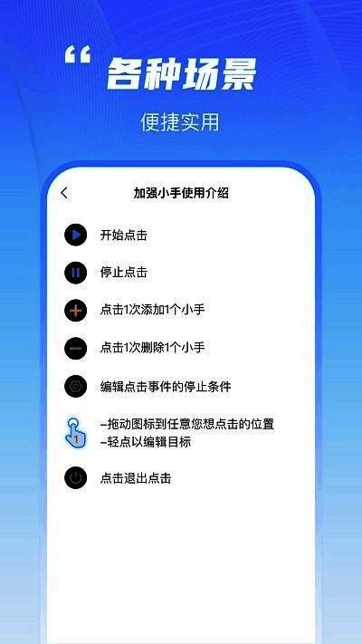 鲨鱼连点器安卓版是一款实用的新型自动点击工具软件,可以模拟各种场景进行自动点击。在软件中,您可以解放双手帮助用户完成点击任务,也可以设置定期点击。它也可以作为用户玩游戏的好工具,可以用来模拟点击和记录手势。它是最适合手机购物和抓取商品的软件,具有很好的辅助功能,可以帮助用户轻松发布。