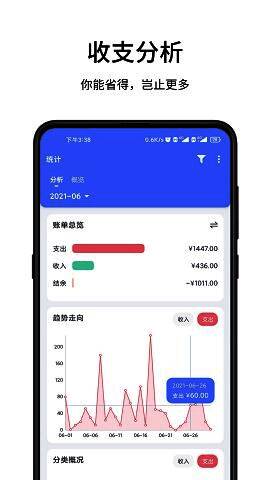 3.自动统计:自动计算每日收入和支出数据,让您轻松查看自己的财务状况;