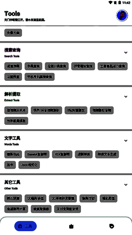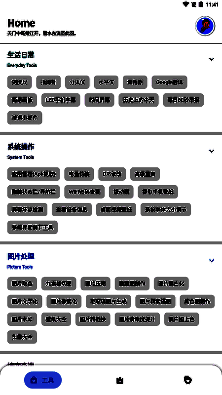 七点工具箱 无广告官网入口因其简单和无广告的页面设计而大放异彩。它涵盖了七大类功能,包括日常生活、系统操作、图像处理、搜索和查询、解析和提取、文本工具和其他工具。每一类都有无数实用的工具,从满足你的日常需求到提高工作效率。更好的是,所有这些功能都是免费登录和不受限制的,让您享受便捷的体验。在这里,我们还带来了全面的功能,可以很好地满足每个人的工具箱使用需求。经常使用小工具的朋友不要错过。立即下载并体验!