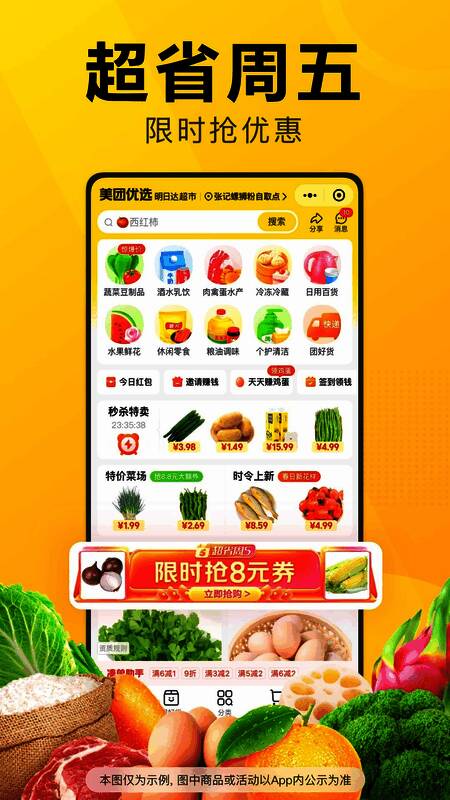 2.实时折扣查看:促销活动选项功能,用户可以实时查看系统每天不定期更新的折扣食材,享受购物折扣;