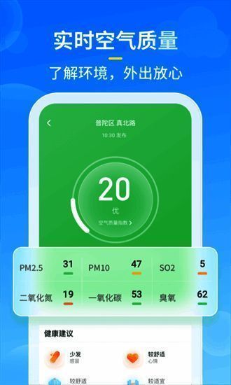除了基础天气信息外,软件还提供如穿衣建议、洗车推荐、紫外线强度、钓鱼适宜度、运动与旅游指数等实用生活建议,帮助用户更科学地安排日常生活。