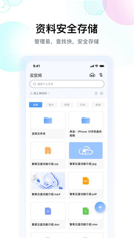 智家云盘是一款非常好用的云储存软件,在这里大家可以轻松管理自己的照片、视频和各种格式的文件,能够自动帮助大家对数据进行备份,非常的安全,可以轻松释放大家手机内的空间。同时还支持大家进行家庭云共享,一人上传,多人都可以实时共享,对大家的工作、学习都非常的有帮助,非常便捷轻松。将需要存储的个人照片、文件上传至云端,便捷存储,随时下载。