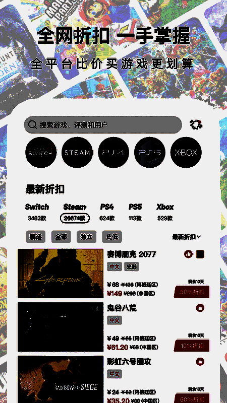 1.以历史低价玩3A游戏:比较Switch、Steam、Playstation和Xbox游戏的全球价格,并接收实时商店折扣提醒,以防止您错过骨折和历史低点。半价玩3A游戏不是梦。任天堂、索尼PC、微软Xbox玩家的游戏折扣助手。