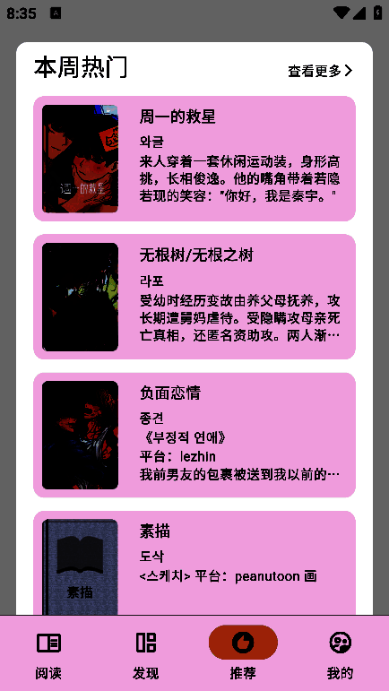猫番阅读 漫画免费读最新版是最好的免费版漫画和小说工具。该版本去除了广告,是一款资源丰富的漫画和小说阅读软件,能够满足用户的阅读需求。这里的小说漫画资源非常丰富,更新速度也很快。也能为用户提供良好的阅读体验。是为爱看小说漫画的人量身打造的移动阅读平台。各种经典动漫内容可以在这里免费阅读,让用户第一时间看到最新出版的漫画。还提供了该小说源代码的免费版本。