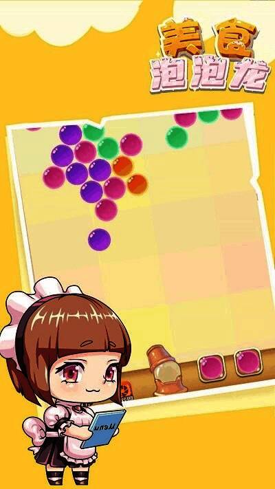 1、玩家控制泡泡发射器,发射相同颜色的美食泡泡,与屏幕上的泡泡进行配对消除;