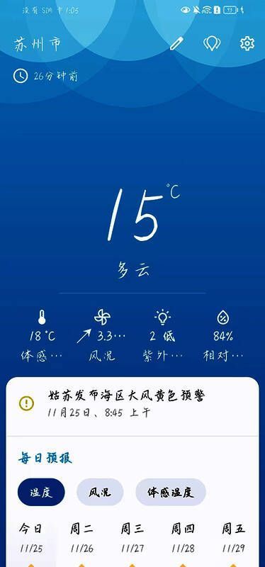 1.如果想了解当前的实时天气,也可以使用微风天气天气预报软件获取信息。可以知道温度、湿度、风速、降水概率等数据,让你对今天的天气有一个精准的了解。