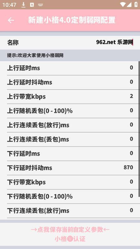 小格加速2.0最新版本下载可帮助用户免费监测网络环境并优化网速。该软件搭载最新参数系统,支持用户自定义调整配置,特别适用于游戏场景,能有效提升运行速度且具备病毒防护机制,保障使用安全。其功能支持弱网环境模拟,可实时执行丢包优化、延迟测试等操作,通过参数调整优化网络表现,兼容各类移动设备网络管理。快速的检测各种网络波动来保证自己的游戏运行,多种功能实时更新,匹配最新的游戏版本!