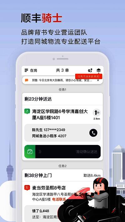 顺丰同城骑士是一款热门的同城快递急送软件,可以为用户提供全面的快递查询,轻松了解快递包裹信息,时长,派件等,给用户带来全面的服务和体验,还支持一键查询周边的顺丰网点,方便用户轻松寄快递,能完全满足用户的使用需求,同时该软件也内置多种功能和选项,可以让用户自由接受各种订单并配送,自由享受便携的快递派送服务和操作,还具有简洁的界面设计,可以自由管理并查询快递包裹,有兴趣的用户欢迎下载。