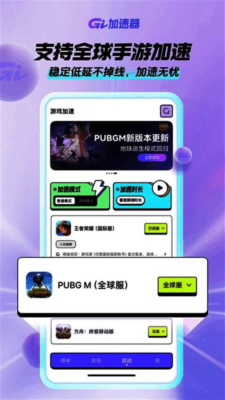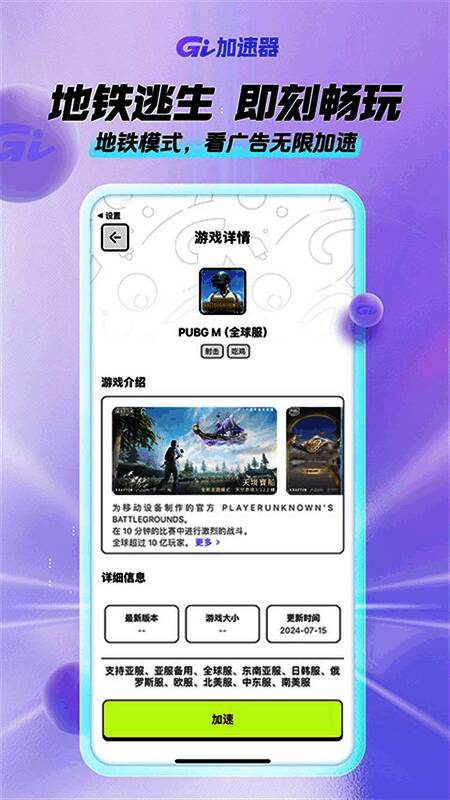 GI手游加速器是一款口碑相当不错的手机游戏加速器软件,软件采用了简洁清爽的操作界面并且更是在主界面上汇聚了一系列非常实用的功能,相关用户在这里只需动动手指便可以对PUBGM(地铁逃生)、王者荣耀国际服、暗区突围国际服、宝可梦TCG、使命召唤战区等一系列游戏进行加速操作。另外,该软件只需看广告便能够实现无限加速,软件还支持WIFI、4G、5G自由切换操作,从而能够很好的适应于不同的网络环境。