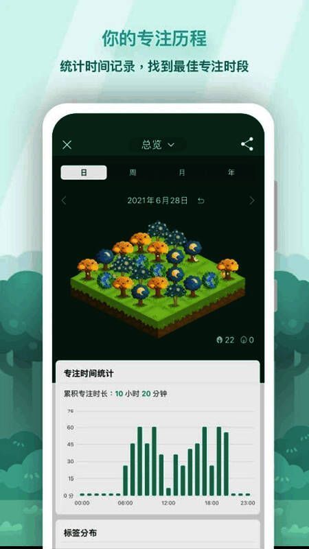 Forest专注森林官方正版提供自定义任务标签,以便用户可以跟踪他们在不同任务上花费的时间,并形成详细的时间分配报告。同时,用户可以通过周、月、年的时间维度回顾自己在森林中的专注旅程,有助于养成长期的时间管理习惯。Forest还可以将专注的时间数据同步到App(HealthKit,进一步整合个人健康和生活习惯的数据分析,促进身心健康的整体管理。感兴趣的朋友不要错过下载。