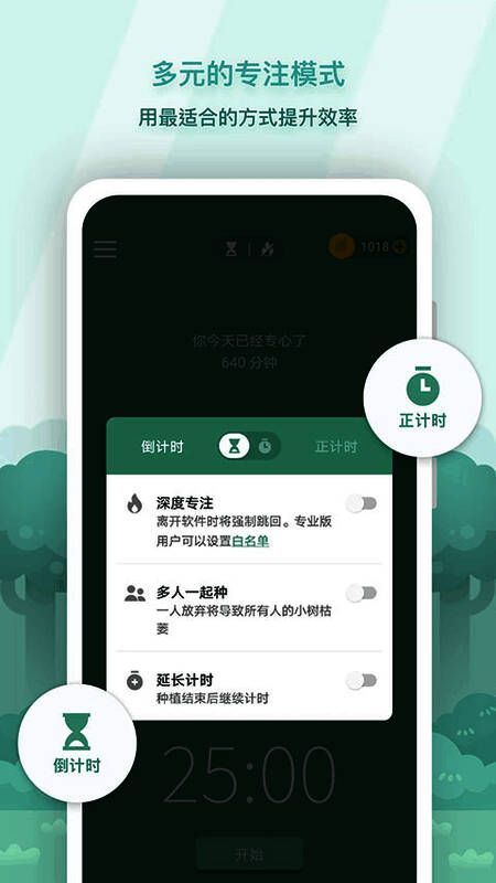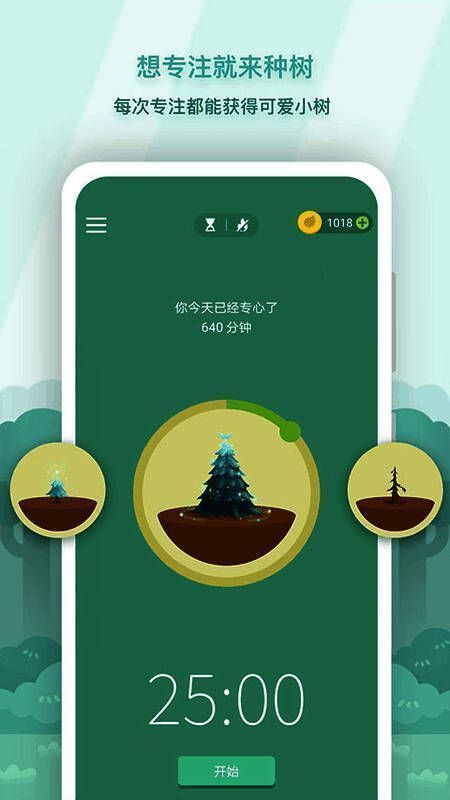 3、视觉森林成长:用户通过专注将时间变成森林中的树木,每一片森林都是专注的视觉体现,将抽象的时间具体化,鼓励用户保持专注,投身于有意义的事情。