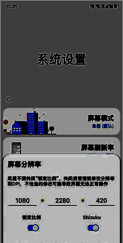3、系统设置:屏幕模式、屏幕分辨率和 DPI 、屏幕刷新率、动画速度(需要通过 ADB 或 Shizuku 或 ROOT 授权)、系统文件管理读写/ Android/data /、系统界面调节、移动网络模式、移动网络频段、暗码功能--暗码功能包括:系统转储、硬件测试、 USB 模式、固件版本、电池状态、服务模式。
