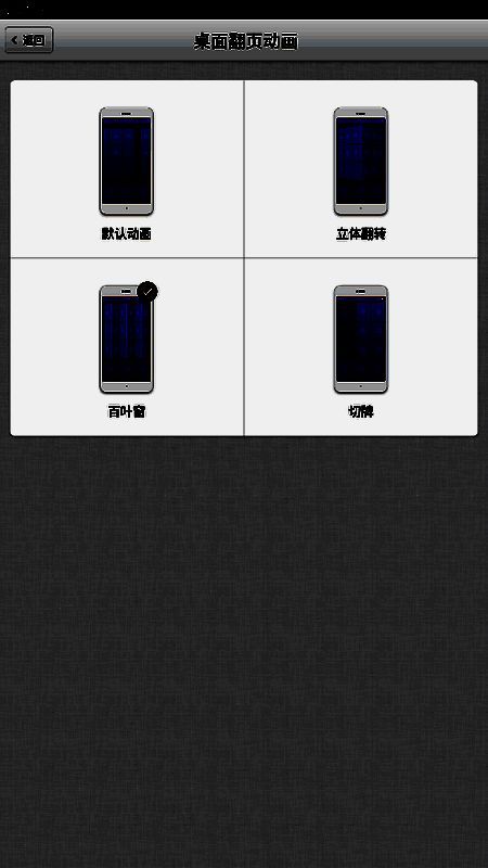 3.自定义设置很方便,可以选择玻璃、木纹等不同的桌面主题。,以及不同的切页动画。