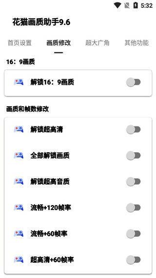 2、点击画质修改,玩家们可使用解锁16:9画质、解锁超高清、全部解锁画质、解锁超高音质、流畅+120+60帧率、超高清+60帧率等功能;