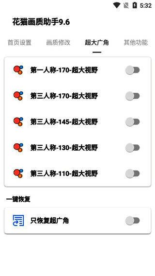 1、在本站下载并花猫画质助手,在软件的首页设置玩家们可以使用切换游戏版本、启动游戏、闪退修复、一键恢复所有画质等功能;