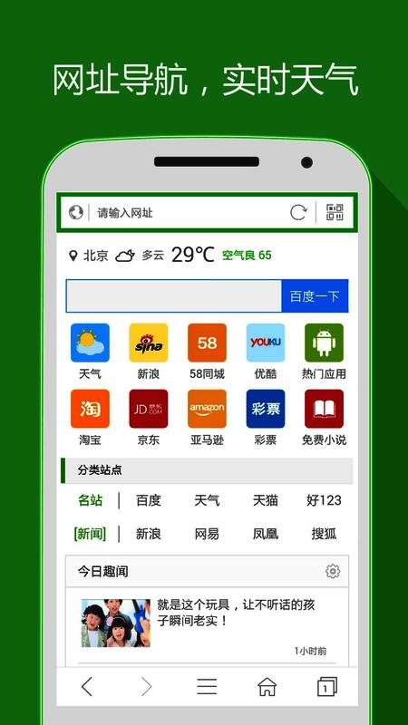 1、打开浏览器应用,进入主界面,您会看到一个简洁的绿色屏幕,上面有几个图标和文字提示。