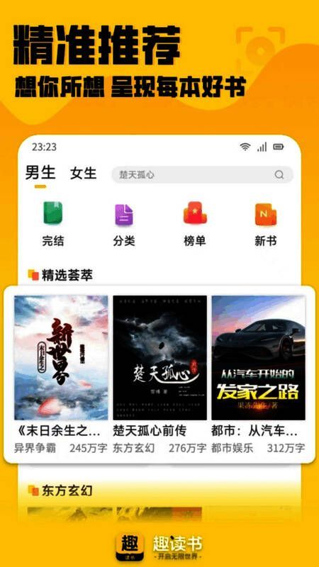 趣读书下载全书免费是一款非常受欢迎的自由追书阅读神器,为用户整理了很多精品小说书籍资源,还为用户收藏了各种热门小说,完本小说可以自由选择查看,随时免费阅读看书,给用户带来优秀的追书阅读之旅,而且该软件也具有全面的推荐功能,可以根据用户的阅读历史记录和浏览,轻松呈现很多精彩且热门的小说图书,随时随地在线阅读感兴趣的小说和最新内容,能完全满足用户的所有阅读需求,有兴趣的用户欢迎下载软件吧。