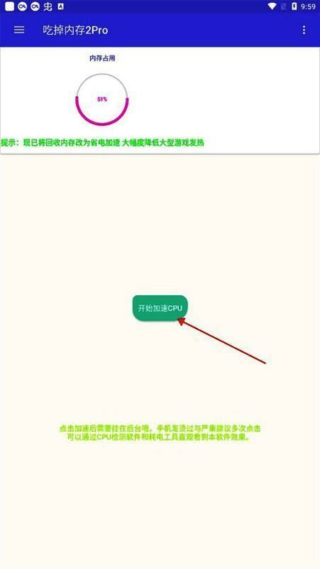 4、点击加速后需要挂在后台哦,手机发烫过与严重建议多次点击,可以通过CPU检测软件和耗电工具直观看到本软件效果;