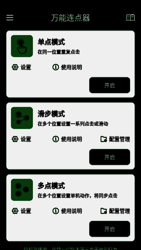 万能连点器手机版免费版是一款多功能的任务连点器,拥有非常智能的连点选项,可以让用户自由设置连点任务,随时享受快速的连点操作,给用户带来非常顺利的服务和体验,而且该软件也提供多样化的辅助功能,随时完成更便携的连续点击,能完全满足用户的使用需求,用户也可以自由修改连点模式,自由完成各种快速连续点击,同时软件也能自动兼容多个系统和平台,随时进行各种连续点击操作,有兴趣的用户欢迎下载。