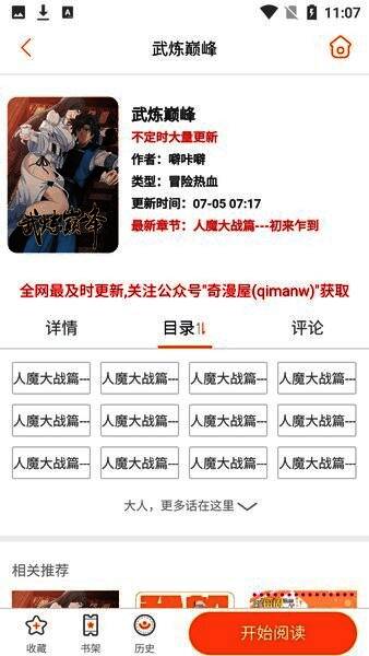奇漫屋 全本漫画免费读是一款漫画阅读软件,从互联网上收集漫画资源,为每个人提供丰富多样的漫画阅读资源。在这里,您可以找到各种高质量的中国、日本、韩国和其他漫画作品,所有这些都是原创和未删减的漫画,让您体验到原创和令人兴奋的漫画故事。该平台已删除所有广告和弹出窗口,为您带来更舒适的漫画阅读体验。您还可以将您最喜欢的作品下载到本地手机,使您摆脱网络限制,随时随地享受漫画世界。