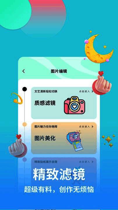 1.提供有趣的贴纸功能,选择各种有趣的贴纸,以增加您的照片的兴趣和个性;