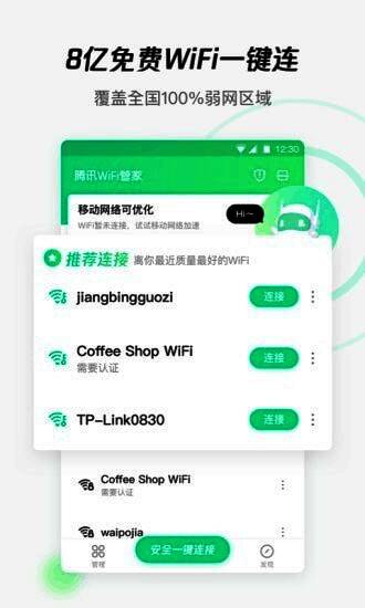 腾讯WiFi管家安卓版是一款简单易用的手机WiFi软件,拥有全面的WiFi优化,加速等功能,随时让用户自由优化手机WiFi网络,轻松提升网络的速度,还可以及时帮助用户解决网络问题,能完全满足用户的使用需求,还为用户提供全面的游戏游戏模式,自由让用户畅玩体验,给用户带来优秀的服务和操作,而且该软件也具有简单的WiFi工具,随时帮助用户及时连接附近的WiFi网络,自由享受便利的上网体验,有兴趣的用户欢迎下载。