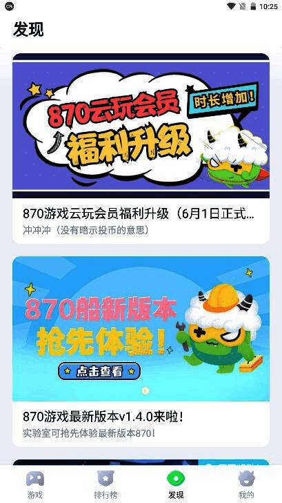 870云游戏2025免费版内置非常全面的游戏资源,可以随时在这里自由发挥。不用下载,直接打开就能轻松玩,也可以在线打开。覆盖各类3A端游戏和各类大型手游,完全不用担心配置问题。