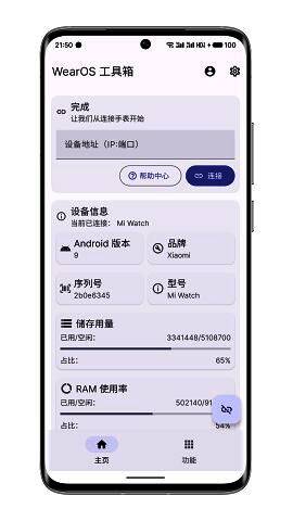 4、接着在本站下载并安装wearos工具箱软件,保证两台设备在同一wifi下,并在首页输入“通过WLAN调试”下方出现的ip地址以及端口完成连接