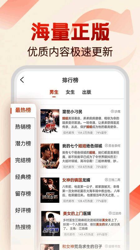 必看小说下载手机版是一款简单的自由看书软件,拥有丰富且全面的小说类型和榜单,随时让用户在线获取各种精彩的小说书籍,随时免费阅读看书,给用户带来优秀的小说阅读服务,还收藏了各种各样的精品小说书单,可以让用户自由选择查看,轻松阅读喜欢的小说和最新内容,能完全满足用户的所有阅读需求,而且该软件也具有简洁的小说界面设计,可以自由设置小说字体,阅读背景等,随时随地自由阅读感兴趣的小说书籍。