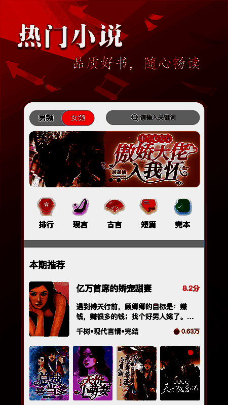 这款软件致力于为每一位书迷打造专属的阅读天堂,还为用户提供细致入微的分类和题材,方便用户自由选择查看,随时免费阅读精彩的小说书籍,轻松带领用户穿梭在浩瀚的书籍海洋中,免费阅读喜欢的小说。