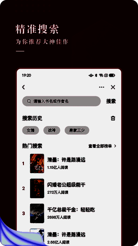 甜荔小说拥有庞大的图书库,涵盖了多种类型的小说,包括都市、玄幻、言情、悬疑等,全面覆盖不同读者的兴趣点。同时,软件内置高效精准的搜索功能,用户只需输入小说名称或作者,即可快速找到目标作品,大大节省了查找时间。
